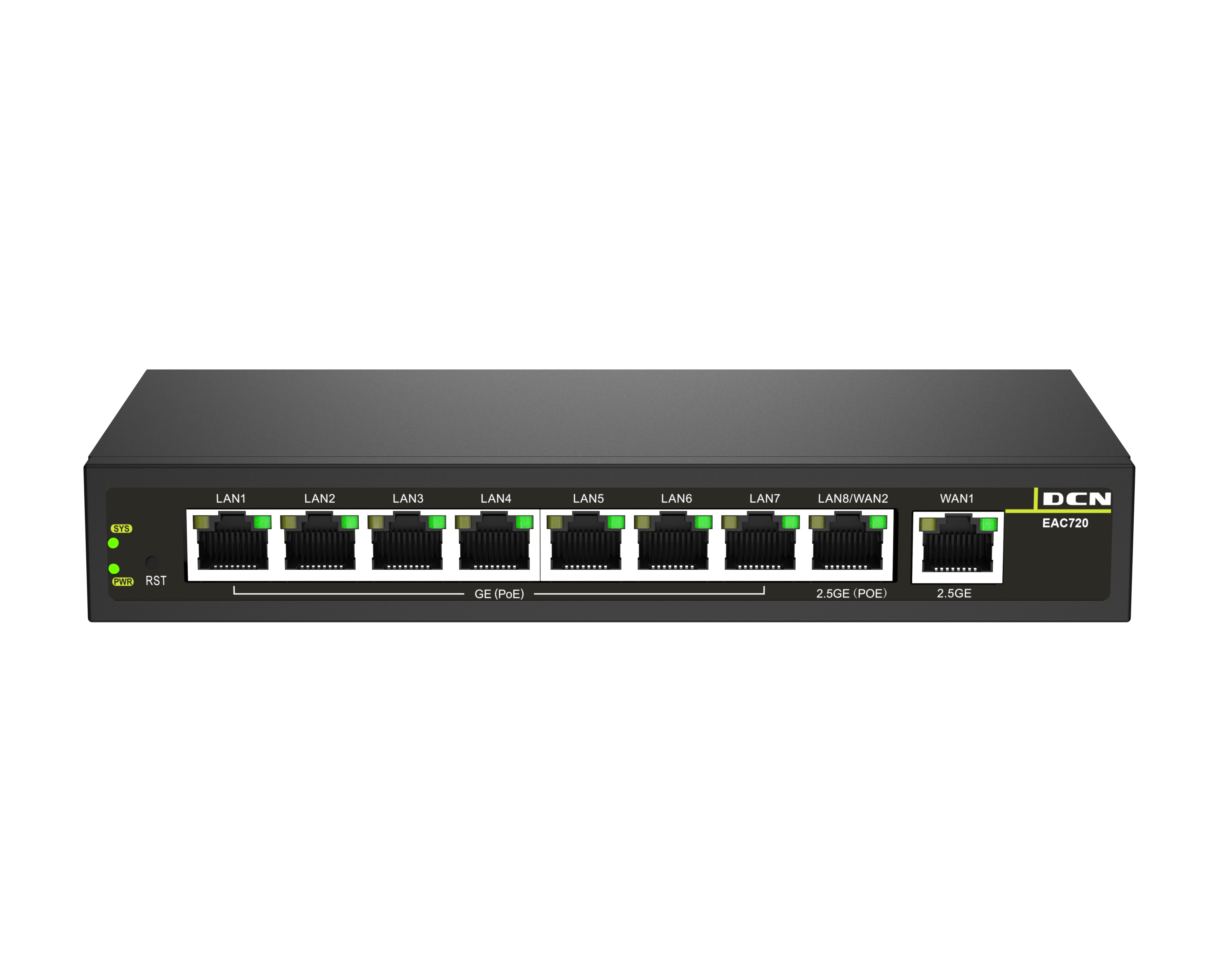 EAC720 POE网关型控制器,支持1个2.5G WAN端口+1个2.5G WAN/LAN端口+7个千兆LAN 端口,最大PoE输出功率86W,最大可管理256个AP,默认含256个AP管理许可,最大出口带宽2.5Gbps,路由场景最大并发终端数200个 |