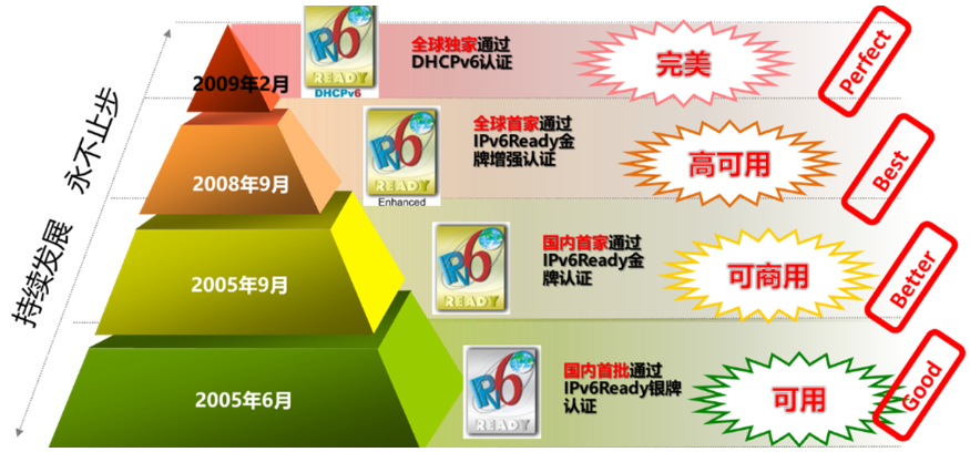 evo真人视讯是国内首个顺利获得IPv6 Ready Phase2 认证的网络厂商,也是全球首个顺利获得IPv6 Ready Phase2 Enhance认证的网络厂商,还是全球最早顺利获得DHCPv6认证的网络厂商。