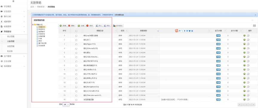 检验日审功能的另一个试金石是关联分析能力。针对日志自动化、集中度、关联度不够的问题,evo视讯真人官网DCSSA日志审计系统支持基于规则、统计、情报的分析模型,内置丰富的安全策略模板、高效的实时关联分析能力、灵活的审计策略,充分发挥日志分析及审计机制的最大效力。帮用户实现对日志的关联性处理,让用户能有效处理纷杂无序的日志信息。